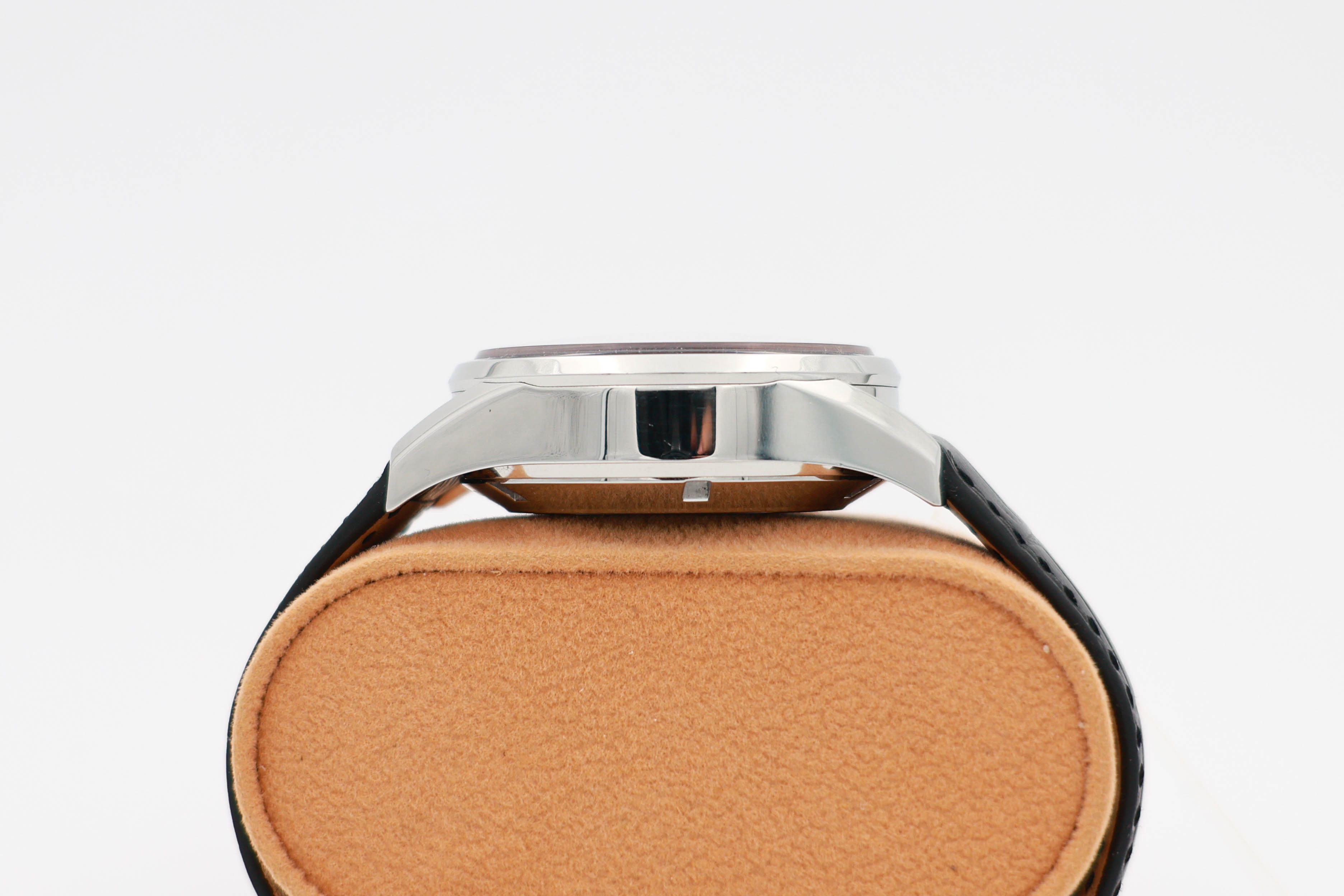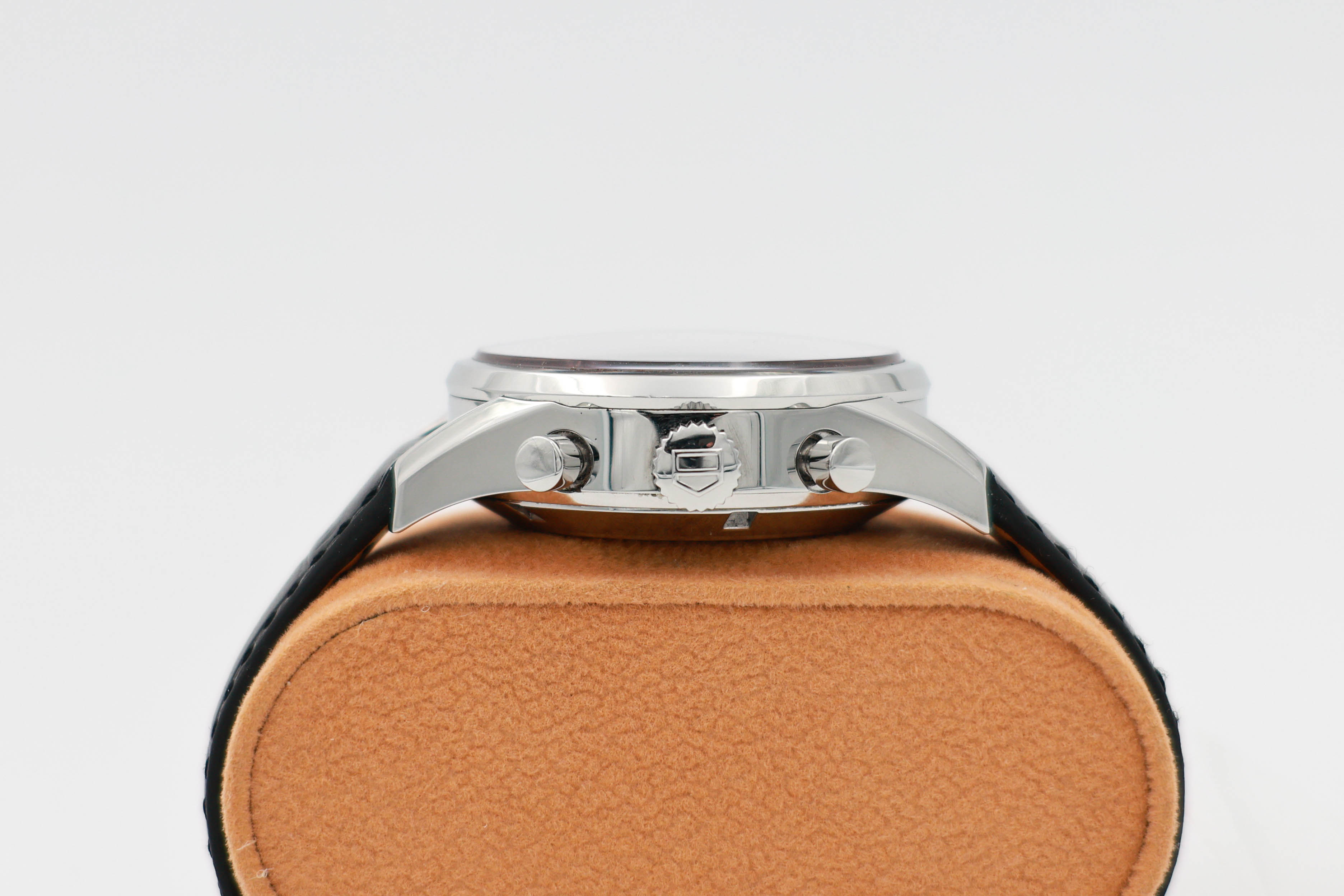 양끝에 크로노 조작계와 가운데에 태그호이어 로고가 있는 용두가 있다.